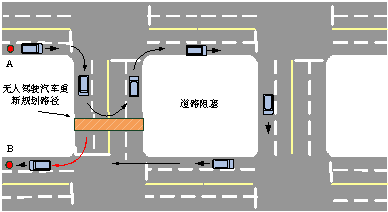 如图7所示,从A点到B点最短的道路被隔断之后,无人驾驶汽车能够重新规划路径,到达目的地。