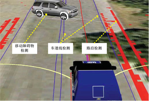 无人驾驶汽车的“眼睛”必须能够感知和识别行驶车道的周边的物体,如图3所示,摄像头能够看到实际场景,可以辨识车道线和交通信号,检测运动目标等;激光雷达则通过激光点云来建立周边环境的3D模型,检测出包括车辆、行人、树木、路缘等;微波雷达用于检测运动目标,感应车身周围的移动障碍物等。最后融合成一幅如图3的车辆“眼睛”看到的场景。