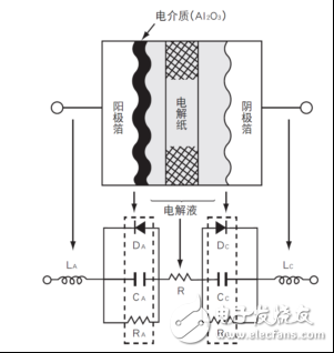 交流电流流过铝电解电容时,会产生损耗,因为铝电解电容的电解液、电解纸和其他接触电阻的存在,铝电解电容等效于串联了电阻R,见图7、图8和图9。