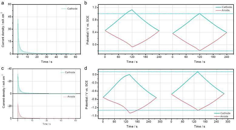 (c-d) 通过同时对正、负电极的开路电位调控,使用碱性电解液(1.0 M KOH)碳基超级电容器的P0V正移0.1 V,使整体器件的电位窗口达到最大。