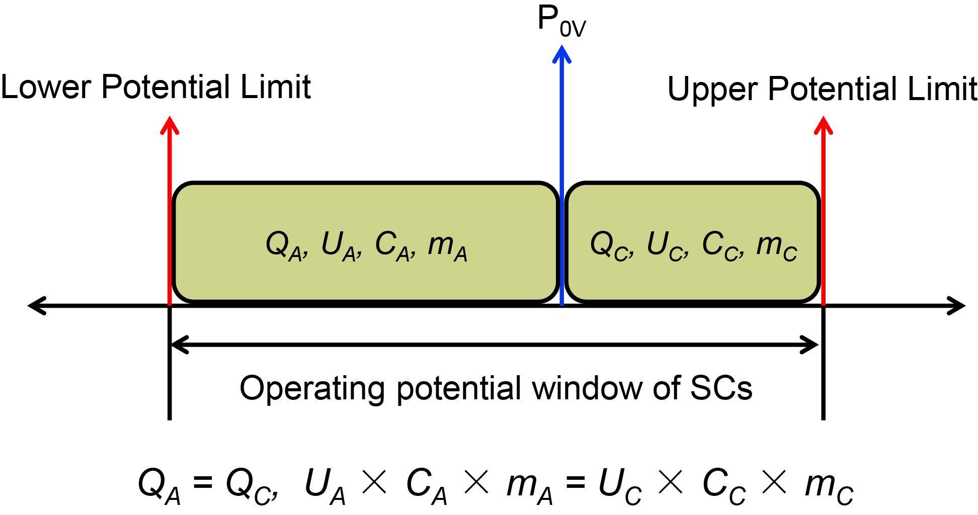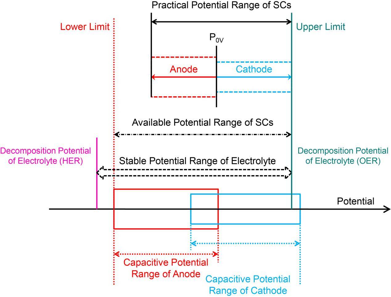上图展示了电容器电极实际电位变化(Practical Potential Range of SCs)、电容器电极理论可用电位区间(Available Potential Range of SCs)与电极表现电容性质的电位范围(Capacitive Potential Range)以及电解质稳定电位范围(Stable Potential Range of Electrolyte)的关系。