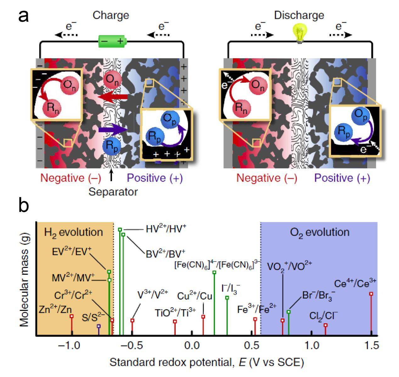 图2. (a)电解液中的氧化还原活性对的电化学储能机理示意图。(b)多种氧化还原活性对在酸性(红点)、中性(绿点)、碱性(蓝点)电解液中的还原电位。图片来自文献。