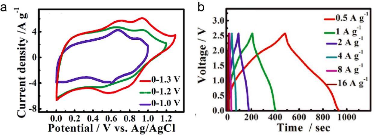 与此同时,通过设计电极,引入反应动力学快速的氧化还原反应以抑制水分解反应也是一种有效拓宽超级电容器工作电压的方法。图4展示的是一种钠离子嵌入修饰后、可达到1.3 V vs. Ag/AgCl电位的二氧化锰电极的CV曲线。其与碳包覆的四氧化三铁(Fe3O4@C)负极组成的非对称电容器的最大输出电压已高达2.5 V。