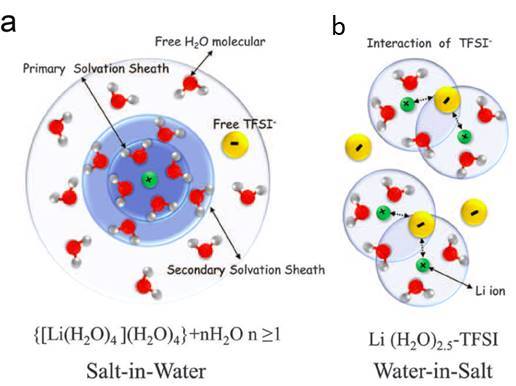 图3. (a)Li+在普通水溶液与(b)Water-in-Salt型水溶液中的溶剂化模型。图片来自文献[5]。
