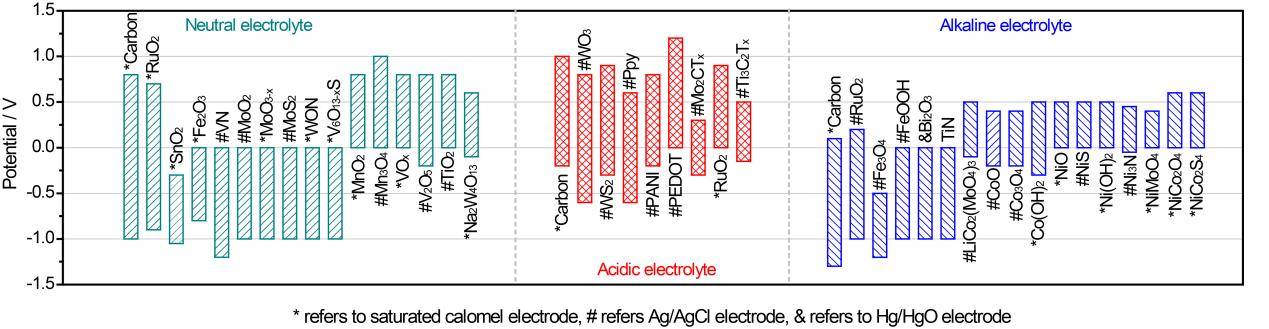 图7. 不同电极的可用电容电位窗口。图片来自文献。