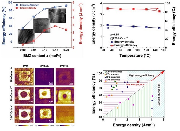 近日,西安交通大学微电子学院汪宏教授课题组通过畴工程调控,开发设计出一种具有高储能密度、高储能效率与优异热稳定性的BaTiO3-Bi(Mg0.5Zr0.5)O3无铅弛豫铁电储能材料。该工作在多重尺度上系统研究了Bi(Mg0.5Zr0.5)O3的添加对BaTiO3基体材料在晶体结构、晶粒尺寸、介电性能与宏观极化状态、击穿场强等方面的影响,尤其是在纳米尺度对BaTiO3-Bi(Mg0.5Zr0.5)O3体系畴结构及其电场动力学的深入探索,为今后弛豫铁电储能材料的研究提供了理论依据。最终,汪宏教授课题组在BaTiO3-Bi(Mg0.5Zr0.5)O3无铅弛豫铁材料中得到了2.9J×cm-3的储能密度与86.8%的储能效率,这是目前报道的无铅陶瓷材料中较优的综合储能性能。同时,该材料在30~150oC的温度范围内表现出优异的热稳定性。