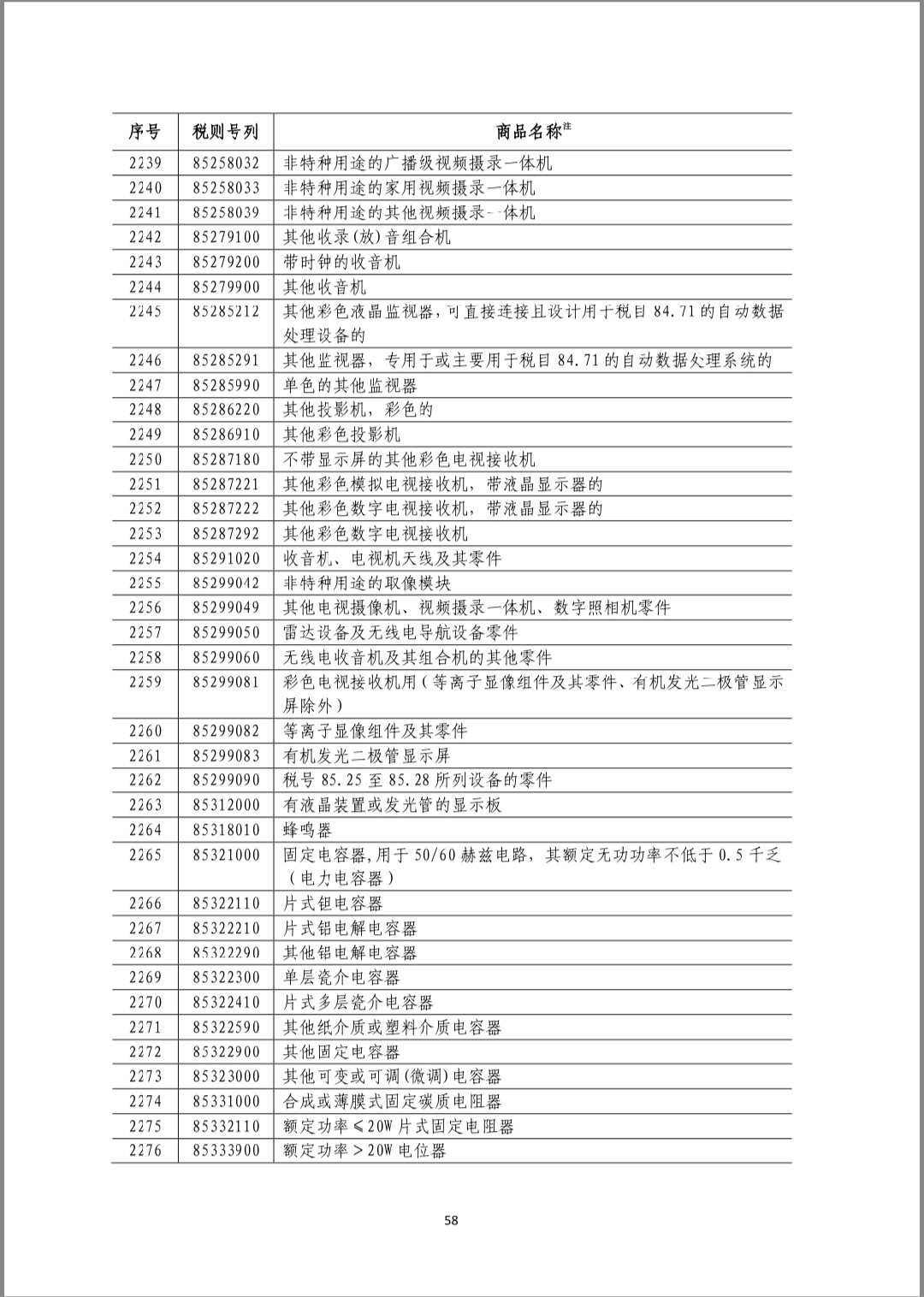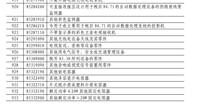 据《电子工程专辑》兄弟媒体《国际电子商情》报道,在清单中,涉及到包括拟对原产于美国的片式钽电容器,片式铝电解电容器,其他铝电解电容器,单层瓷介电容器,片式多层瓷介电容器,其他纸介质或塑料介质电容器,其他固定电容器,其他可变或可调(微调)电容器,合成或薄膜式固定碳质电阻器,额定功率≤20W 片式固定电阻器,额定功率>20W 电位器,各种电阻器零件,未录制信息的闪速存储器、发光二极管LED、发光二极管显示屏、电压≤1000V的电路保护装置,电压>60V的继电器、耗散功率<1W的晶体管、半导体及可控硅等开关元件、>四层和≤四层的印刷电路等加征25%的关税。
